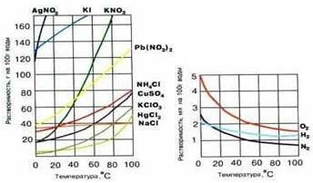 Растворимость большинства (но не всех!) твердых веществ с увеличением температуры увеличивается, а растворимость газов, наоборот, уменьшается. Это связано прежде всего с тем, что молекулы газов при тепловом движении способны покидать раствор гораздо легче, чем молекулы твердых веществ.