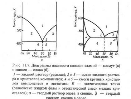 Многие металлы, взаимно растворимые в расплавленном состоянии, при охлаждении образуют смесь кристаллов с различной кристаллической решеткой. Температура плавления такой смеси ниже температуры плавления отдельных компонентов. Состав, имеющий минимальную температуру плавления, называется эвтектикой. Эвтектический сплав состоит из очень мелких кристаллов индивидуальных компонентов. Эвтектическую смесь обычно образуют металлы, близкие по природе, но существенно отличающиеся по типу кристаллической решетки, например, свинец с оловом, с сурьмой, кадмий с висмутом, олово с цинком. На рис. 11.7 приведены диаграммы плавкости сплавов кадмия с висмутом и олова со свинцом. Эвтектические сплавы характеризуются малыми размерами и однородностью кристаллов и имеют высокие твердость и механическую прочность. Поэтому сплавы свинца с оловом и сурьмой применяются в качестве типографских шрифтов и решеток аккумуляторов. Вследствие легкоплавкости сплавы свинца с оловом также применяются для припоев и подшипников.