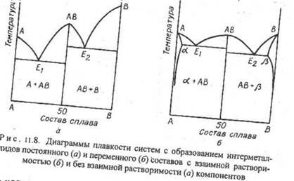 При сильном взаимодействии между металлами образуются химические соединения, называемые интерметаллидами. Диаграмма плавкости таких систем имеет максимум (рис. 11.8). Химические соединения могут иметь постоянный (дальтониды, рис. 11.8, а) или переменный состав (бертоллиды; рис. 11.8, б). Наряду с интермеллидами в системе возникают эвтектики ( Е1 и Е2, рис. 11.8). Кроме того, возможна взаимная растворимость компонентов (фазы aиbрис . 11.8). Возможны и более сложные диаграммы плавкости.