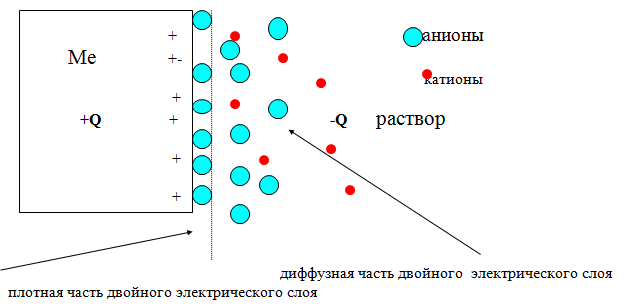 При этом на межфазной границе образуется двойной электрический слой, обкладками которого являются поверхность металла, несущая, например, положительный заряд, и пограничный слой раствора, в котором распределены катионы (+) и анионы (-) таким образом, что суммарный заряд этого пограничного слоя равен заряду металла, но имеет противоположный знак (см. рис. 2,3)