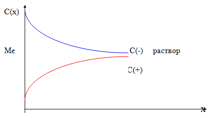 Рис. 3. Распределение катионов С(+) и анионов С(-) вблизи границы металл-раствор