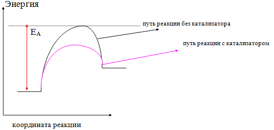 При введении в систему катализатора средняя энергия молекул исходных веществ и продуктов реакции не изменяется, но меняется путь реакции, по которому реакция переходит из начального состояния в конечное, при этом высота энергетического барьера по новому пути оказывается ниже.