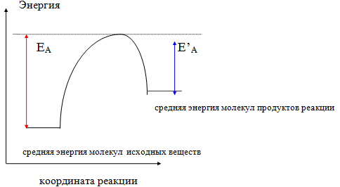 По вертикальной оси отложена энергия реагирующих молекул, а по горизонтальной оси - координата реакции (путь реакции от исходных веществ к продуктам реакции). На этой схеме через ЕА обозначена энергия активации (высота энергетического барьера) для прямой реакции, а через Е’А- энергия активации для обратной реакции.
