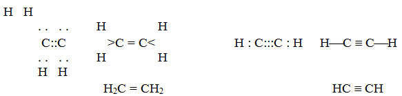 Из сопоставления электронных формул метан и этана с обычными структурными формулами следует, что каждая простая связь между атомами осуществляется одной обобщенной электронной парой. Соответственно в веществах с кратными связями двойная связь возникает вследствие образования соединяющимися атомами двух, а тройная – трех обобщенных электронных пар. Электронные структуры и обычные структурные формулы, например, этилена и ацетилена имеют вид: