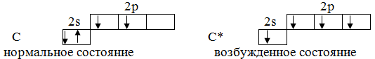 Из курса неорганической химии известно, что электронная структура невозбужденного атома углерода может быть выражена формулой 1s22s22p2, т.е. во втором (внешнем) электронном слое у него два спаренных (с противоположными спинами) s- электрона и только два неспаренных p-электрона, которые могут участвовать в образовании ковалентных связей. Следовательно, углерод должен был бы проявлять валентность, равную двум, однако в большинстве своих соединений он четырехвалентен – образует четыре ковалентные связи. Это объясняется тем, что при затрате некоторой энергии происходит "расспаривание" 2s- электронов: один из них переводится на свободную орбиту подуровня 2p, и атом переходит в возбужденное состояние (2s22p2 2s12p3), или графически: