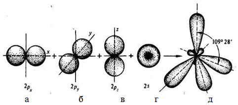 Когда углерод, проявляя валентность четыре, соединяется простыми (ординарными) связями с четырьмя другими атомами, электронная плотность облаков всех четырех валентных электронов перераспределяются. Происходит гибридизация одного s- состояния и трех p- состояний электронов. В результате во внешнем электронном слое связанного углеродного атома возникают четыре одинаковых гибридных состояния. Занимая эти состояния, валентные электроны образуют гибридные облака, имеющие вид деформированной восьмерки (Рис.3 д), большая часть которой направлена от ядра по линии связи с другим атомом.