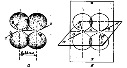 Таким образом, одна из электронных пар двойной связи между атомами углерода осуществляют обычную s-связь, вторая электронная пара образуется электронами не участвующими в гибридизации и сохранившими p-состояние. Облака этих электронов, сохранившие форму объемных восьмерок, направлены перпендикулярно к плоскости, в которой расположены s-связи молекулы этилена и перекрываются над и под этой плоскостью.