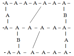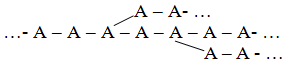Пространственные полимеры с трёхмерной структурой характеризуются наличием цепей макромолекул, связанных между собой силами основных валентностей при помощи поперечных мостиков, образованных атомами (-В-) или группами атомов, например мономерными звеньями (-А-)