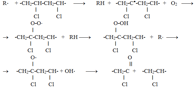 Распад начинается уже при температуре 160-180 оС. Образуется HCI (до 95 % хлора переходит в него).