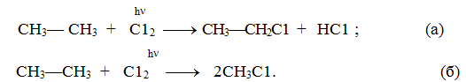При анализе протекания реакций с формальных позиций не понятно, почему при действии С12 на С2Н6 идет замещение атомов водорода, а не разрыв связи углерод — углерод. Энергия разрыва связи С—Н составляет 414 кДж/моль, а связи С—С - лишь 339 кДж/моль. Однако всегда проходит реакция (а), а не (б):