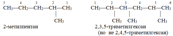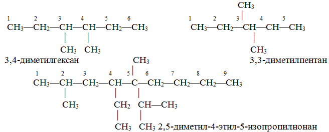 Разветвленные насыщенные углеводороды называют исходя из названия самой длинной нормальной цепи и добавляя в качестве приставки названия боковых заместителей. Атомы углерода самой длинной нормальной цепи последовательно нумеруют, начиная с того конца главной цепи, к которому ближе боковое ответвление. А если в равных положениях от концов цепи находятся различные по сложности заместители, начало нумерации ведут со стороны главного (простейшего) заместителя (СН3-). (Чем меньше атомов углерода в цепи, тем старше он считается.) И, кроме того, направление нумерации выбирают так, чтобы сумма цифр, указывающих положение заместителей (локантов), были наименьшими.