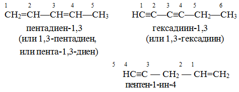 Полиненасыщенные углеводороды (полиены). Названия ненасыщенных ациклических углеводородов с двумя, тремя и более двойными связями получают с помощью суффиксов, соответственно -диен, -триен и т. д. Углеводороды с двумя, тремя и более тройными связями получают суффиксы соответственно -диин, -триин и т. д. Углеводороды, имеющие как двойные, так и тройные связи, получают суффиксы -енин, -диенин и т. д.