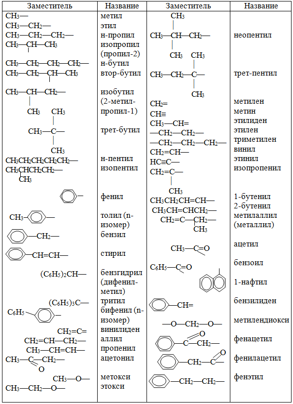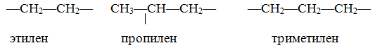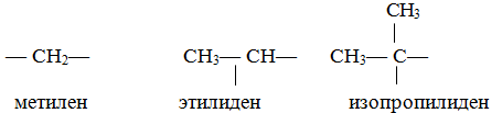 Двухвалентные радикалы, образованные отнятием атомов водорода от двух разных атомов углерода, имеют в простейших случаях названия: