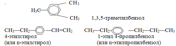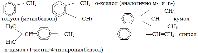 Другие ароматические углеводороды рассматривают как производные бензола либо как производные вышеназванных углеводородов, если вводимый заместитель не идентичен уже имеющемуся в данном соединении. Положение заместителей обозначают наименьшими номерами или приставками орто-, мета-, пара (о-, м-, п-)