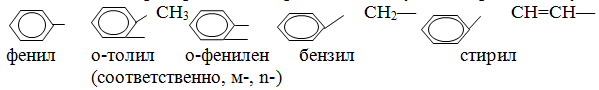 Названия некоторых радикалов ароматических углеводородов следующие: