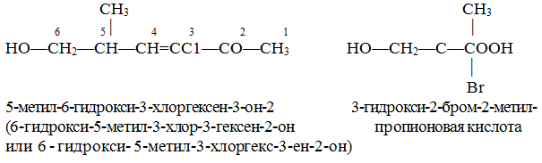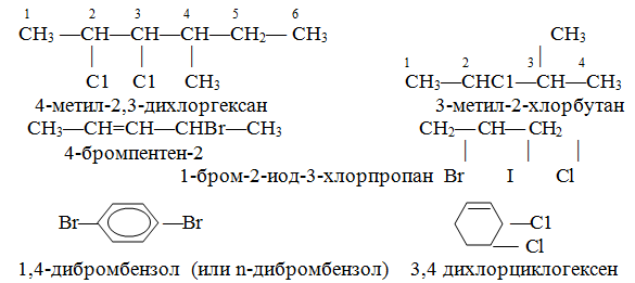 Галогенопроизводные углеводородов называют, прибавляя в качестве приставки название галогена к названию соответствующего углеводорода. Нумеруют цепь или атомы цикла так, чтобы галоген получил наименьший номер (цифру). Если цепь ненасыщенна, то предпочтение в нумерации отдается центрам ненасыщенности. Сумма цифр, указывающих положение заместителей, перечисляемых в приставках, должна быть наименьшей; перечисление заместителей идет в алфавитном порядке: