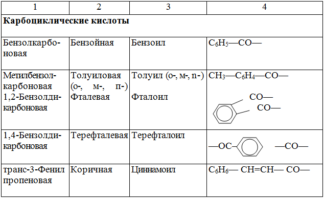 | Этандиовая Пропандиовая Бутандиовая Пентандиовая Гександиовая | Щавелевая Малоновая Янтарная Глутаровая Адипиновая | Оксалил Малонил Сукцинил Глутарил Адипоил | —ОС—ОС— —ОС— СН2— СО— — ОС— (СН2)2— СО— — ОС— (СН2)3—СО— — ОС— (СН2)4—СО— | |