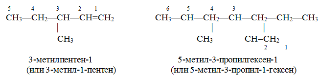 Этиленовые углеводороды (алкены). Названия ненасыщенных углеводородов с одной двойной связью (алкенов) образуют, заменяя суффикс -ан в названии соответствующего алкана на -ен. В качестве главной выбирают самую длинную углеродную цепь, содержащую двойную связь, и нумеруют ее так, чтобы двойная связь получила наименьший порядковый номер. (Правила ИЮПАК не строго регламентируют место цифры, обозначающей положение двойной связи. Ее ставят вслед за суффиксом -ен, обозначающим двойную связь, или выносят вперед, ставя перед корнем слова, но после префиксов, обозначающих заместители.)