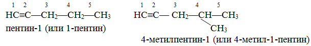 Ацетиленовые углеводороды (алкины). Названия ненасыщенных углеводородов с одной тройной связью (алкины) образуют из названия соответствующих алканов, заменяя суффикс -ан на -ин. Выбирают самую длинную цепь, содержащую тройную связь, и нумеруют ее таким образом, чтобы положению тройной связи соответствовал наименьший номер: