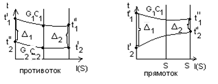 через разности температур на концах потоков. Наиболее широко применяется противоток и прямоток.