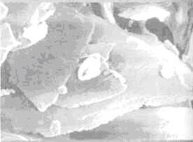 На рис. 34 показана адсорбция смолы на поверхности талька. Адсорбированные частицы смолы уже не могут образовывать вредные отложения, т.к. тальк удаляет смолу из процесса в невредной форме вместе с конечным продуктом. Если все же произошло образование агломератов, тальк адсорбирует их на своей поверхности и значительно снижает их прилипание (рис.35).