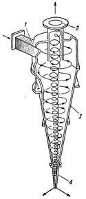 Рис.47 - Схема очистки от тяжеловесных примесей:1- патрубок для подачи массы; 2- патрубок для отвода массы; 3- корпус очистителя; 4- насадка