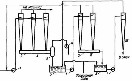 Для снижения потерь волокна, уходящего вместе с загрязнениями устанавливают три или четыре ступени очистки. На рис. 48 приведена схема трехступенчатой установки вихревых конических очистителей.