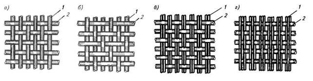 Рис.  81 - Виды плетения сеток: а – одинарная сетка (льняное плетение); б – одинарная сетка (полусаржевое плетение); в – двойная сетка; г – тройная сетка:1 – нити основы; 2 – нити утка