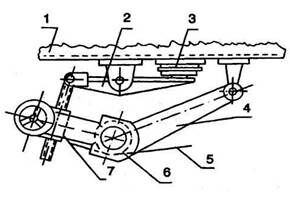 1 – продольная балка; 2 – рычаг мембраны; 3 – мембрана; 4 – рычаг натяжного вала; 5 – сетка; 6 – натяжной вал; 7 – редуктор червячный с маховиком