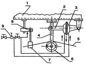 1 – продольная балка; 2 – рычаг мембраны; 3 – мембрана; 4 – рычаг сеткоправильного вала; 5 – сетка; 6 – сеткоправильный вал; 7 – лопатка; 8 – управляющий вентиль; 9 – редукционный клапан