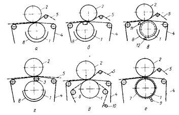 Рис. 103 - Схемы прессов: а – с гладкими валами; б – отсасывающий; в – с желобчатым валом; г – с промежуточным валиком; д – с подкладной сеткой; е – с сетчатым чулком; 1 – нижний вал; 2 – верхний вал; 3 – промежуточный валик; 4 – сукно; 5 – бумага; 6 – подкладная сетка; 7 – сетчатый чулок; 8 – корыто; 9 – воздушный шабер; 10 – отсасывающий ящик; 11 – шабер; 12 – металлическая пластина