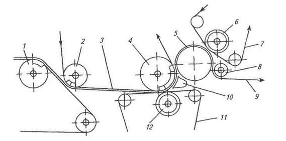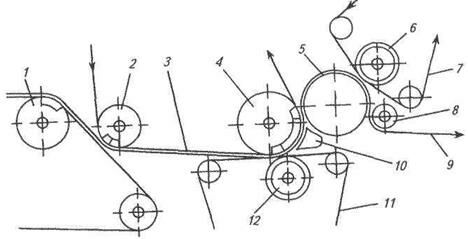 1 – гауч-вал; 2 – пересасывающий вал; 3 – сукно пикап; 4 – отсасывающий вал; 5 – гранитный вал; 6, 12 – желобчатые валы; 7 – верхнее сукно; 8 – бумаговедущий валик; 9 – бумажное полотно; 10 – паровая камера; 11 – нижнее сукно