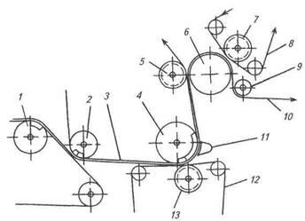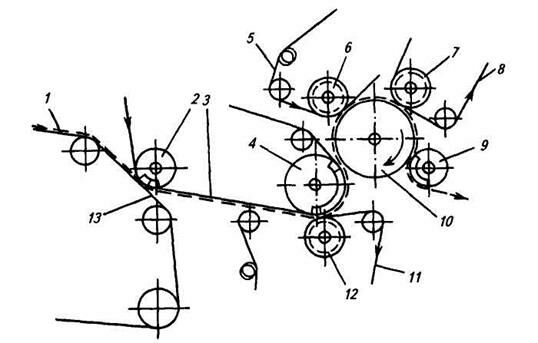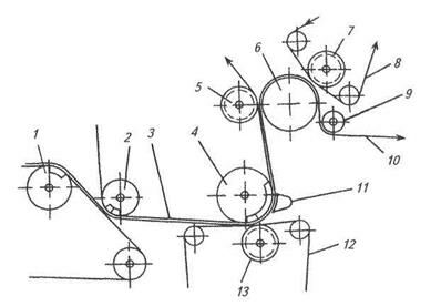 1 – гауч-вал; 2 – пересасывающий вал; 3 – сукно пикап; 4 – отсасывающий вал; 5, 7, 13 – желобчатые валы; 6 – гранитный вал; 8 – верхнее сукно; 9 – бумаговедущий валик; 10 – бумажное полотно; 11 – паровая камера; 12 – нижнее сукно