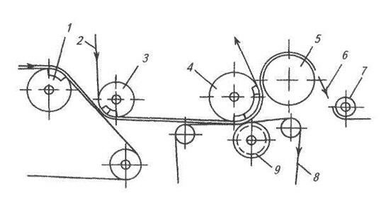 1 – гауч-вал; 2 – сукно пикап; 3 – пересасывающий вал; 4 – отсасывающий вал; 5 – гранитный вал; 6 – бумажное полотно; 7 – бумаговедущий валик; 8 – нижнее сукно; 9 – желобчатый вал