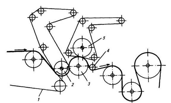 1 – сетка; 2 – отсасывающий вал; 3 – гранитный вал; 4 – бумаговедущий валик; 5 – желобчатый вал