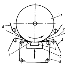 Рис.104 - Схема прессов фирмы «Beloit » (а): 1 – верхний вал; 2 – полотно; 3 – нижнее сукно; 4 – башмак; 5 – камера; 6 – лента; 7 – место подачи смазки; 8 – верхнее сукно; «Flexonip » фирмы «Voith » (б) с расширенной зоной прессования: 1 – ротационный верхний вал; 2 – особо длинная зона прессования; 3 – верхнее сукно; 4 – бумага; 5 – нижнее сукно; 6 – ротационная пластиковая рубашка