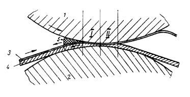 Рис. 122- Механизм прессования (I, II – фазы обезвоживания): 1 – верхний вал; 2 – нижний вал; 3 – бумажное полотно; 4 – прессовое сукно; 5 – вода