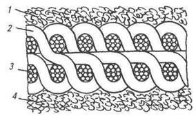 1 – верхняя ватка; 2 – поперечные нити основы; 3 – продольные нити основы; 4 – нижняя ватка