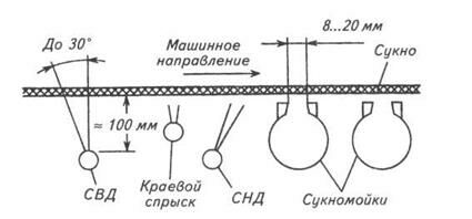 Большое влияние на эффективность работы СВД оказывает также расстояние от спрыска до сукна. Обычно оно составляет 100…150 мм, т.к. на таком расстоянии струя сохраняет еще компактную форму.