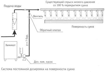 При прессовании в зоне контакта валов в сукно вместе с вытесняемой из бумажного полотна водой переходят твердые частицы (мелкие волокна, наполнитель и т.д.), проклеивающие вещества, влагопрочные смолы. Они задерживаются в порах сукна, что ведет к снижению его проницаемости. Особенно опасно неравномерное забивание сукна по ширине, ведущее к появлению на бумажном полоне мокрых полос. В результате на бумаге в сушильной части образуются морщины и неизбежна пересушка бумаги для устранения участков с повышенной влажностью. Для поддержания сукна в нормальном состоянии применяются различные системы кондиционирования. Процесс кондиционирования обычно включает три основных этапа: