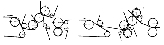 Трёх- и четырёхвальные прессы (рис.105) позволяют уменьшить размеры прессовой части бумагоделательной машины и способствуют снижению обрывности бумажного полотна. Валы этого пресса могут быть различной конструкции, т.е. простые, отсасывающие, желобчатые и др. Расположение валов может быть горизонтальное, наклонное, треугольное и др.