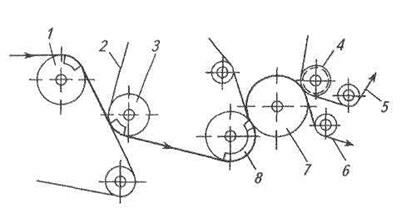 1 – гауч-вал; 2 – сукно пикап; 3 – пересасывающий вал; 4 – верхний желобчатый вал; 5 – сукно; 6 – бумажное полотно; 7 – гранитный вал; 8 – отсасывающий вал