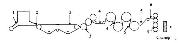 Рис.191 - Исполнительные устройства для управления профилем показателей качества полотна: 1 – управление профилем массы 1м2 путем регулирования расхода воды по ширине потокораспределителя напускного устройства; 2 – управление профилем массы 1м2 путем регулирования степени открытия губы по ширине напускного устройства; 3 –управление профилем влажности полотна путем регулирования расхода пара на спрыски, устанавливаемые в мокрой части машины (сетке, прессах); 4 –управление профилем влажности полотна путем регулирования подачи инфракрасной энергии в секционные излучатели, которые устанавливаются в сушильной части; 5 –управление профилем влажности полотна путем регулирования расхода воды на распылительные форсунки, устанавливаемые в сушильной части; 6 – управление профилем гладкости полотна путем регулирования паровых спрысков каландровых валов; 7 –управление профилем толщины полотна путем регулирования мощности индукционных нагревателей каландровых валов