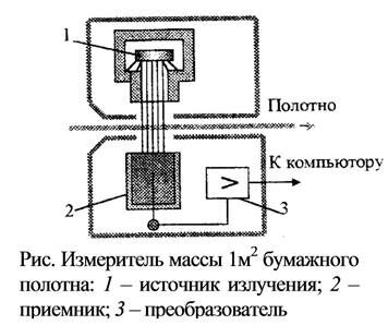 Измерители массы 1м2 бумажного полотна (рис.192). Радиоактивный источник излучает β- или γ-частицы. Часть излучения поглощается бумажным листом. Остальная часть попадает в ионизационную камеру приёмника и вызывает ионизационный ток. Его значение зависит от массы 1м2 полотна, так как пропускание излучения зависит от этой же величины. Далее токовый сигнал преобразуется в цифровой, который передаётся в компьютер.