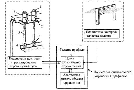Рис. 194 - Принципиальная схема системы управления массой 1 м2 по ширине полотна: 1 – электропривод с питанием, 2 – блок ручного управления, 3 – узел крепления, 4 – линейка губы напускного устройства, 5 – шпиндель, 6 – желоб
