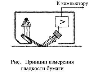 Лучи от источника света фокусируются на полотно. Падающий свет рассеивается неоднородностями поверхности (микровпадинами, буграми). Отраженный свет улавливается, преобразуется фотодетектором, нормализуется и передается в компьютер на обработку, где пересчитывается в показатели гладкости бумаги.
