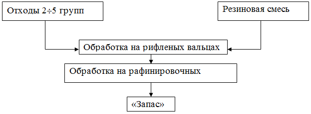 К отходам 2-5 групп на рифленых вальцах добавляют резиновую смесь. После двух-, трехкратного пропуска через рифленые вальцы получается «складка», которую пропускают через рафинировочные вальцы. Полученную смесь условно называют «запасом» (рисунок 2.1)
