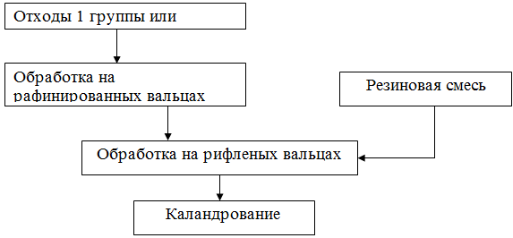Резинотекстильные смеси приготовляют следующим образом (рисунок 2.2). Берут отходы первой группы или «запаса», смешивают на рифленых вальцах с определенным количеством резиновой смеси. Полученная резинотекстильная смесь поступает на участок каландрования.