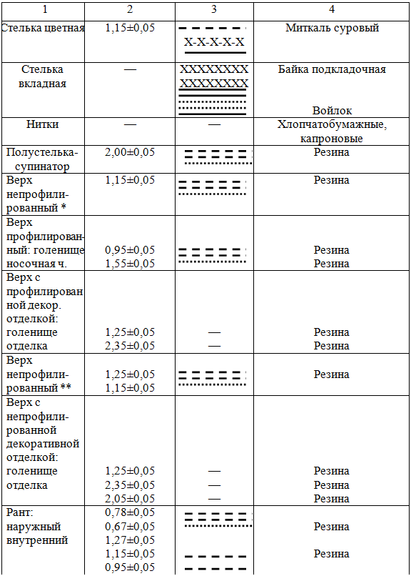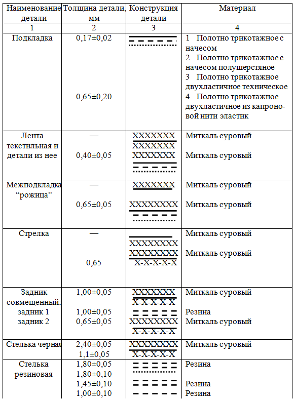 Для обозначения конструкции деталей обуви приняты следующие условные обозначения: