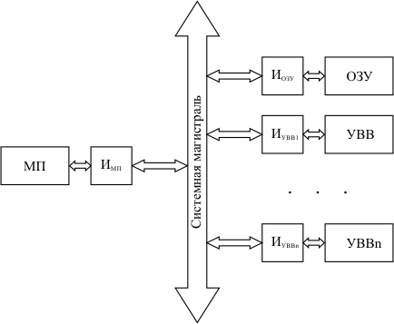 Главным направлением решения указанных проблем является магистрально-модульный способ построения ЭВМ: все устройства, составляющие компьютер, включая и микропроцессор, организуются в виде модулей, которые соединяются между собой общей магистралью. Обмен информацией по магистрали удовлетворяет требованиям некоторого общего интерфейса, установленного для магистрали данного типа. Каждый модуль подключается к магистрали посредством специальных интерфейсных схем (Иi).